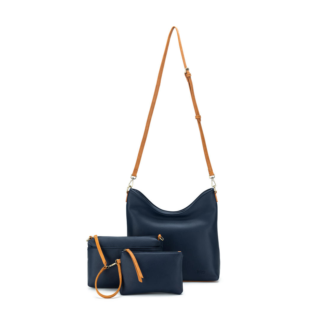 LADIES 3 PIECE HANDBAG SET Timeless, functional, stylish, vegan friendly & affordable... what more could you need? CLOSURE: Zip INTERNAL FEATURES: 1 zip pocket, 1 flat pocket & 1 phone pocket. EXTERNAL FEATURES: Adjustable long shoulder strap convert to crossbody bag. FEATURES: includes matching wristlet and crossbody bag with it’s own strap LINING: Black & white cotton HANDLE HEIGHT: 33.5cm. Adjustable BAG DIMENSIONS: Hx25 Wx32,Dx10cm MATERIAL: Premium Polyurethane PU