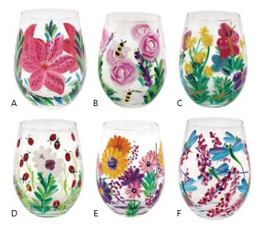 Hand Painted Stemless Glasses - Various Designs Lets get the party started with these fashionable glasses. Available in a great range of designs!! A treat for a special friend, birthday or anniversary or the perfect way to brighten up your table. Beautifully hand blown & hand painted Gift Boxed with window face view Available in 6 beautiful designs A little about the artist - Lynsey Johnstone: In the early years, Lynsey was often found right beside her father as he worked on local farms. The idyllic Scottish coastal scenery with extended views of rolling hills along with local livestock and wildlife, all influenced her art. Memories of time spent in her grandmother's garden continue to resonate with Lindsay as she reflects on the beauty and intense colours of these surroundings. Texture helps to create depth to the landscape and the technique of “flicking paint” which creates the chaos of wild grass and flowers - a picturesque pandemonium. Acrylics add beauty and depth to colours and shapes in these gorgeous flowers we see today.