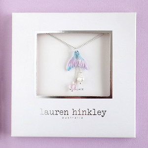 The Mermaid’s Tail Necklace features a translucent mermaid’s tail charm in blue with shades of purple and pink.
