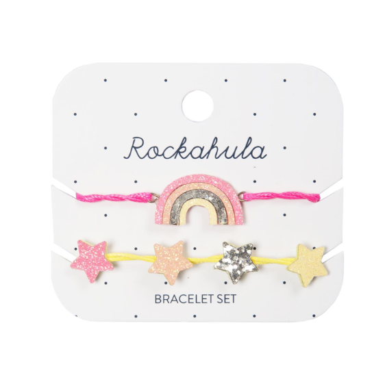 The cheeriest little rainbow bracelet set! One bracelet features our beautiful bright rainbow, and the other a row of gorgeously glittery stars. Both are set onto soft coloured cord with a lobster clasp fastening and extender chain to ensure a good fit.
