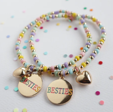With rows of pastel and silver charms complementing a gold heart and medallion declaring BESTIES, this will be a treasured gift for both best friends.