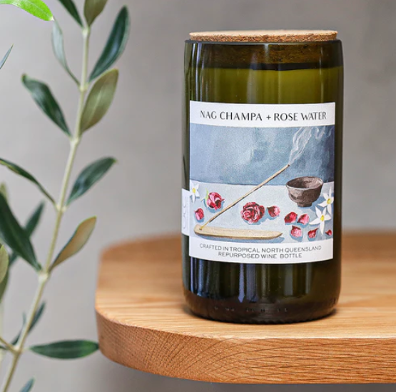 Inspired by the distinctly Indian aroma of nag champa incense, this enchanting candle has the ability to transform any space into a bohemian haven. Earthy notes of neroli and fir needle are paired with lily, coconut husk and the most delicate rose petals to create an irresistible sense of comfort and warmth. Hand Crafted from a Repurposed Wine Bottle | 450g Natural Soy Wax | 80+ Hour Burn | Vegan Friendly