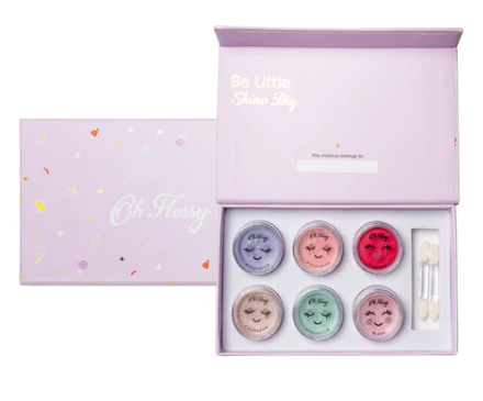 4 x Natural Eyeshadows Fairy Floss Rose Gold Mint Shimmer Purple 1 x Natural Blush - Pastel Pink 1 x Natural Vegan Lipstick - Pink 2 x Applicators A gorgeous makeup kit for little ones who love to dress up and play - and for parents who want to protect their skin from harsh grown up products (& their expensive makeup!). The set is packaged in a luxurious magnetic closing box making it perfect as a special gift! The colours included in the Sweet Treat Set are sweet, colourful, shimmery and designed for hours of fun followed by easy removal without harsh scrubbing or chemicals - just use water! For children who aren't quite reading yet, our lid designs include cute face icons so kids can recognise what each product is used for, giving them independence during their play experience. The products have been formulated by a world-leading Cosmetic Chemist without the use of chemicals or preservatives. The formula is non-toxic, hypoallergenic and the ingredients are 100% natural & vegan so won't irritate sensitive skin. Eyeshadows, blushes and lipsticks are all handmade right here in Australia too! The fun box was designed by local Western Australian Designer Rosa Ronco and was created to inspire kids at playtime. The gorgeous graphics include all of you kids favourite treats, ice-cream, cupcakes & lollipops and it pairs perfectly with our Sprinkle Makeup Brushes for an extra sweet treat! GOOD TO KNOW: All Oh Flossy makeup is proudly free from: Preservatives, parabens, fragrance, nano-particles, phthalates, petroleum (and petroleum by-products), PEG's and talc.