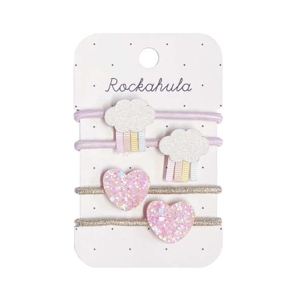 Rainy days can be fun days, with these glittery rainbow clouds! Two little white clouds with pastel rainbow rain, and two shimmering pastel glitter hearts, each set onto an elastic pony.