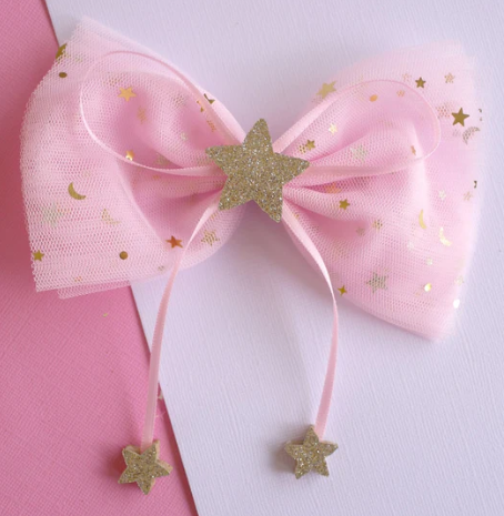 Reach up higher than you ever have before with our beautiful Reach for the Stars Pink Bow Hair Clip. Diamantes twinkle in the folds of the soft pink bow, and a large glittering star shines bright like a diamond with two smaller stars trailing below on the ends of cute pink ribbons. Gold stars 3+ Size- 16cm