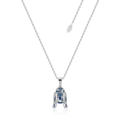 Cheeky, adventurous, brave and resourceful, all reasons we adore this classic Star Wars icon R2-D2. Features Stainless Steel 40cm necklace length plus 7cm extension Pendant length 16mm Includes necklace envelope