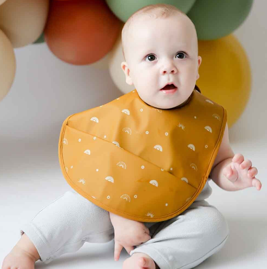 Our Snuggle Hunny bibs are a beautiful way to brighten up mealtimes whilst keeping mess to a minimum. This bib features our exclusive Snuggle Hunny Sunrise design. Perfect for baby gifts.