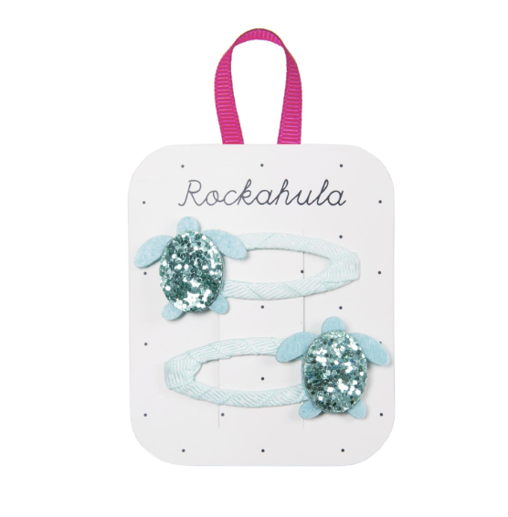 Dive down into the deep blue sea and discover Toby the turtle, with the sparkliest glitter shell and the cutest little flippers. He is secured to two aqua green grosgrain ribbon wrapped snap clips.