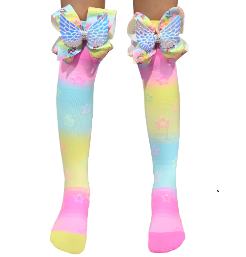 Be a brighter you with a pair of our super colourful Unicorn Bows Socks. These Socks have custom made Unicorn Bows with wings. Kids & Adults Socks Our most popular size. These socks are 'one size fits most' and are suitable for ages 6 - 99. They can fit adults but we recommend up to shoe size EU 41 equivalent to womens size 8/9 AU. Please note, they do have limited stretch around larger or muscular calves. Socks with less busy patterns such as (Mermaid Socks, Liquorice Bows Socks, Bows to Toes Socks) have better stretch and we highly recommend these patterns for adults to avoid stretch issues. Toddler Socks Most suitable size for children aged 3 - 5. If your little one is about to turn 6 soon we would recommend buying our standard 'Kids & Adults' size (for ages 6 - 99).