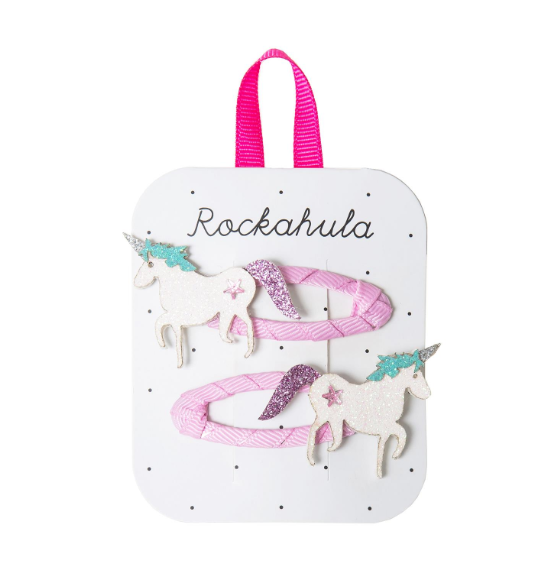 We believe in unicorns! And so can you, with these two glittery beauties, each one secured to a grosgrain ribbon wrapped clip.