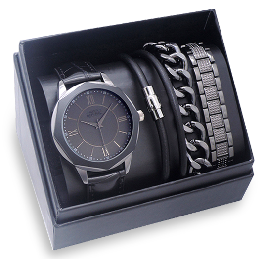 This Men's Republic Watch and Bracelet gift set is perfect for the modern day man. Made with Quartz movement, it features on-trend and latest designs for the man who wants to make a statement. • 1 x Alloy Watch - 4cm diameter • 3 x Stylish Bracelets - approx 20cm - Alloy, Cord Faux Leather Straps • Signature Gift Box